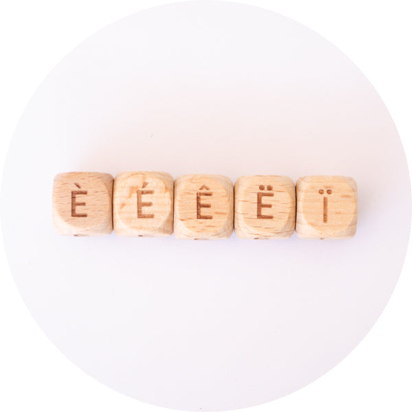 12mm Beech Wood Square Alphabet beads, available in Ë, É, È, Ê, Ï