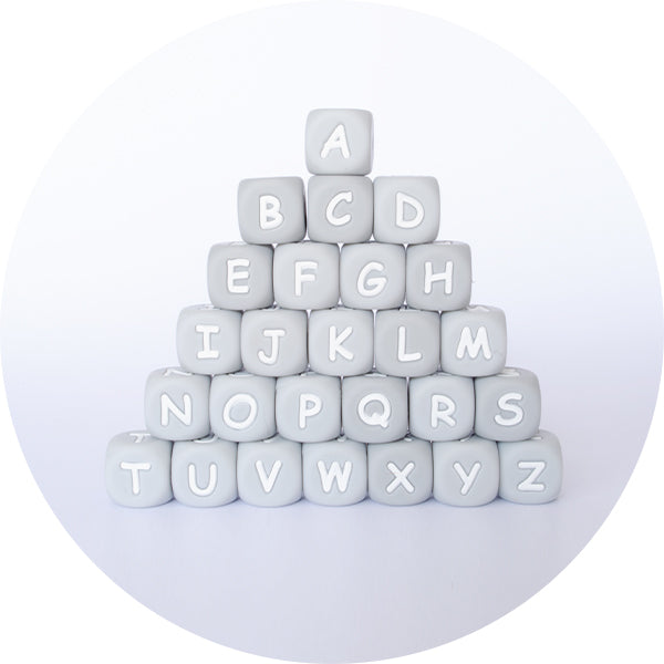 Choose our SILICONE SQUARE FOG GREY ALPHABET STARTER KIT OPTION, this kit contains 125 letters, in the following beads: