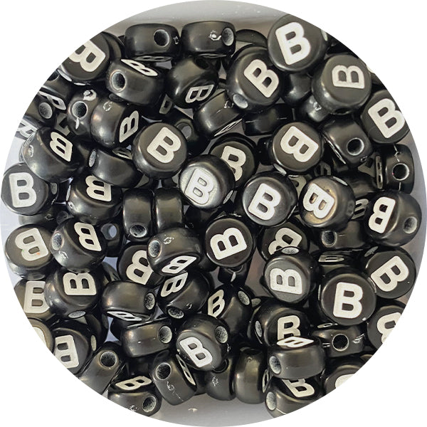 Disc shapes acrylic black alphabet beads, they have a diameter of 7mm. Black with white letters.