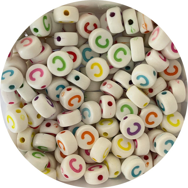 Disc shapes acrylic multicolour alphabet beads, they have a diameter of 7mm. White with assorted colour letters.