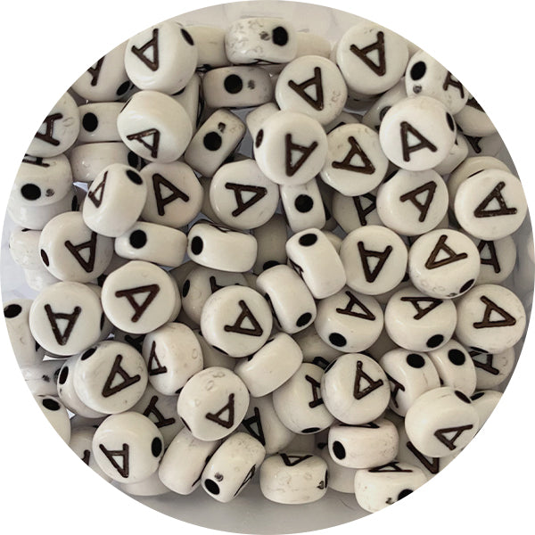 Disc shapes acrylic white alphabet beads, they have a diameter of 7mm. White with black letters.