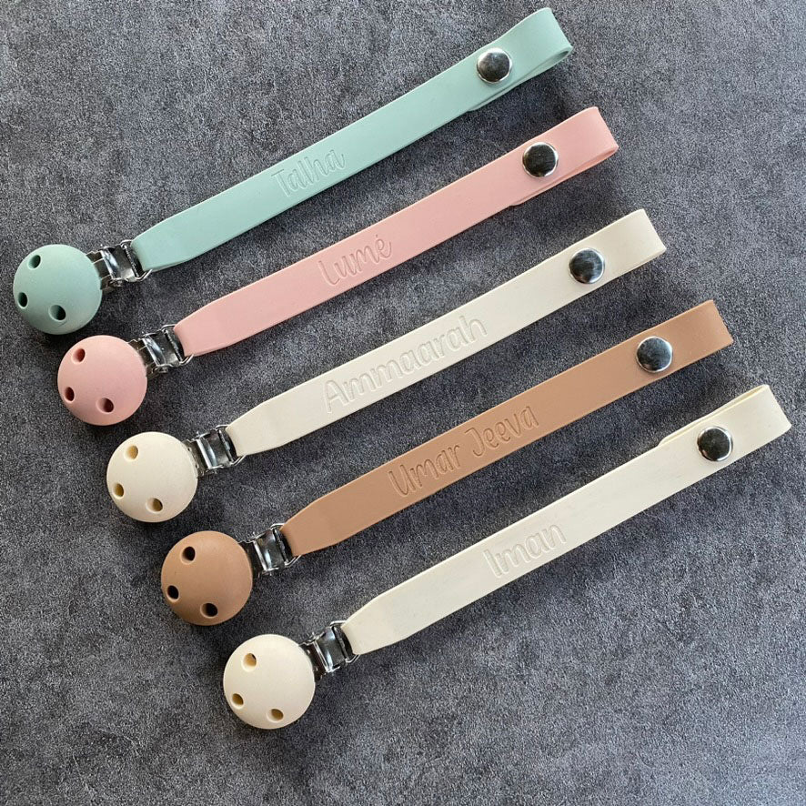But what sets our dummy clip apart is the option for customisation. Engrave your child's name onto the clip, adding a special touch that makes it uniquely theirs. Whether you're looking for a thoughtful gift or a stylish addition to your baby's essentials, our All-in-One Silicone Dummy Clip is the perfect choice. Keep pacifiers close, and style closer with our personalised dummy clip!