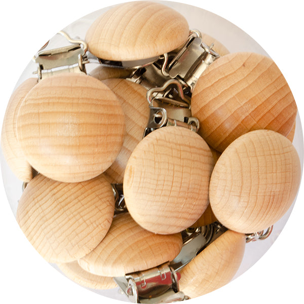 Our small beech wooden round pacifier clips are 30mm in diameter (the full length with the metal clip included is 44mm). The wood is completely natural, and can be treated with any organise oil if you like! Clips are lead free, nickel free, phthalate free, latex free, nitrosamine free, BPA free and PVC free. Excellent quality, strong grip and fashionable!