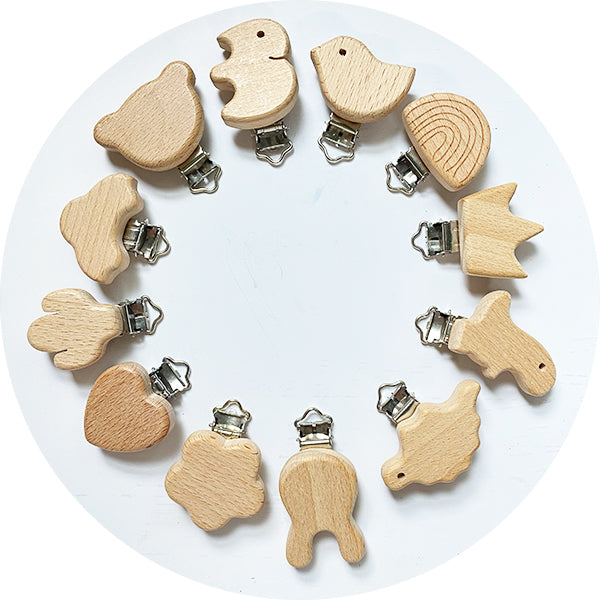 Our shaped beech wooden round pacifier clips are available in 8 different shapes. The wood is completely natural, and can be treated with any organic oil if you like! Clips are lead free, nickel free, phthalate free, latex free, nitrosamine free, BPA free and PVC free.