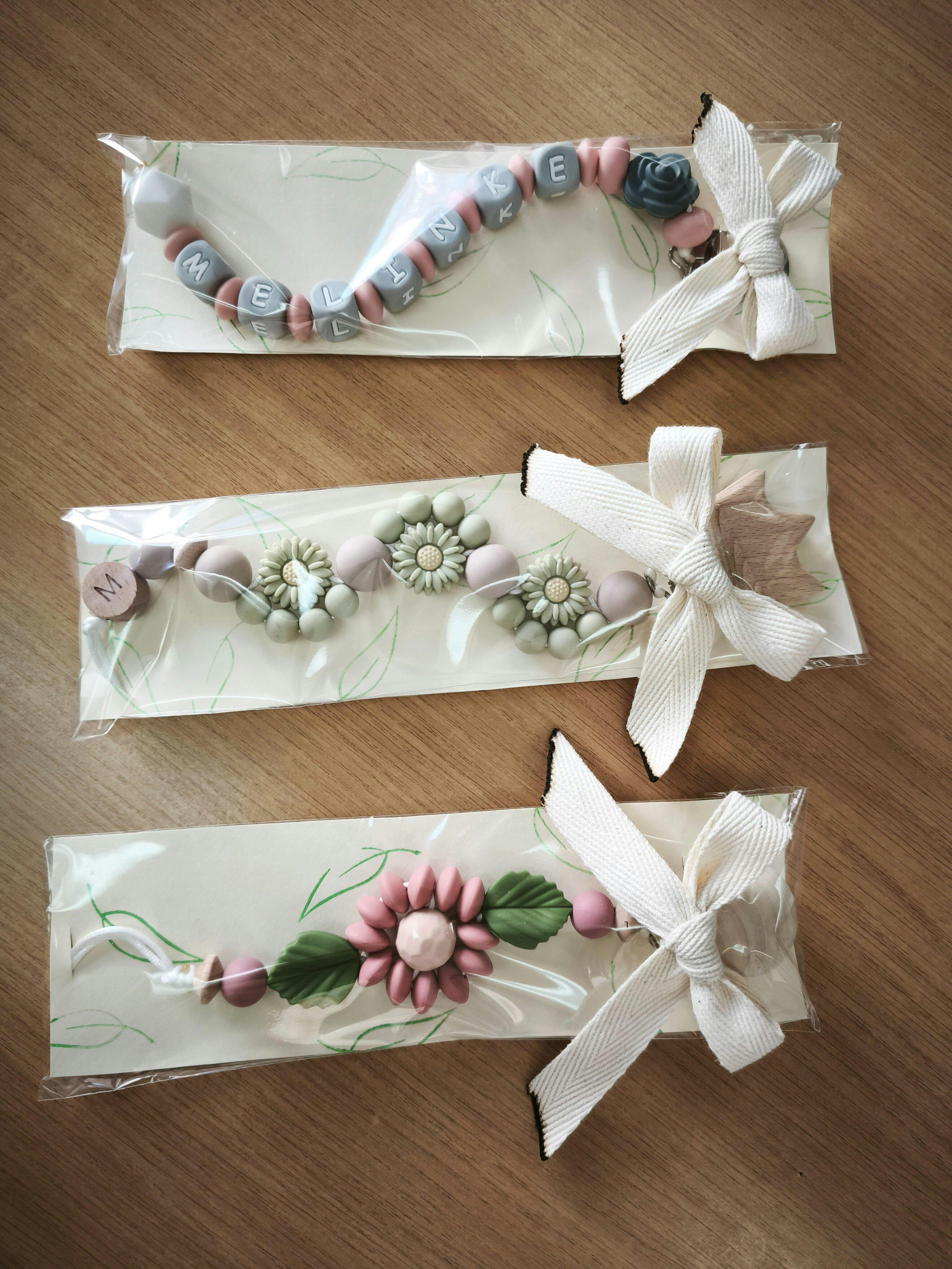 *Small objects and beads can present choking hazards to young children. Never leave a child unattended with beads or other products. Cords, clasps and pacifier clips are not intended to be chewed on and may present choking hazards. Do not expose clips with wood or metal pieces to moisture, drool, or water for any extended period of time. To clean, wipe gently with a damp cloth.