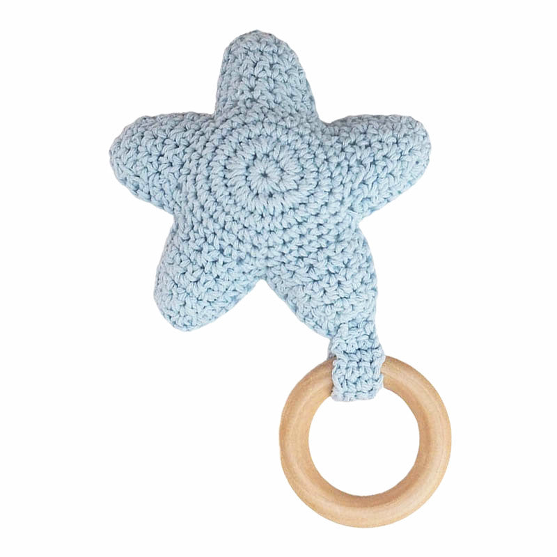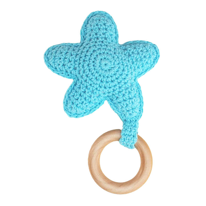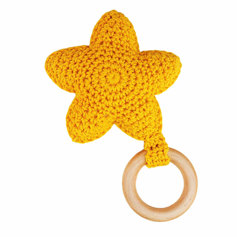 Hanging crochet star on a 55mm wooden ring, available in 8 colours. Perfect to hang from a play gym or on the baby's car seat.