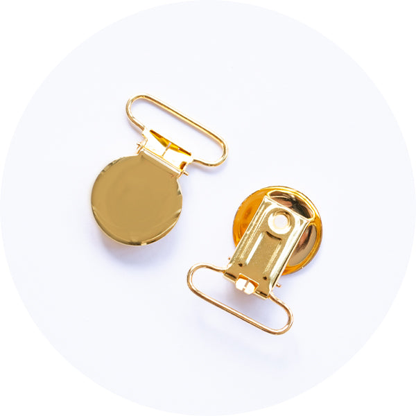 Our gold metal pacifier clip is 22mm round. Clips are lead and nickel free.