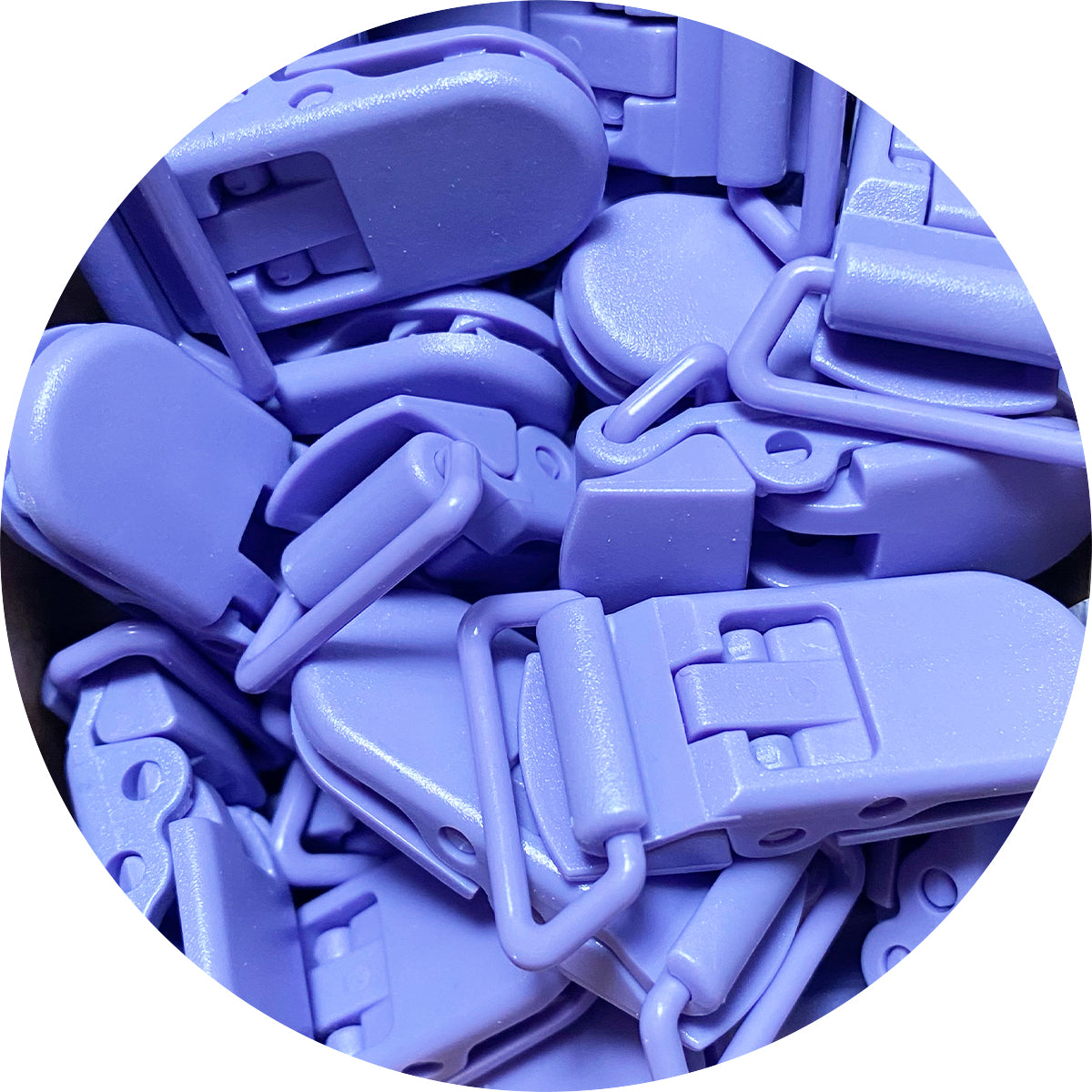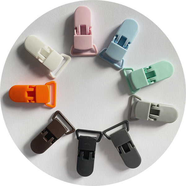 Plastic pacifier clips come in a small variety of colours. Dual closing system to ensure strong grasp and quality structure. Plastic suspender clips with squared opening great for making pacifier holders and bib clips.