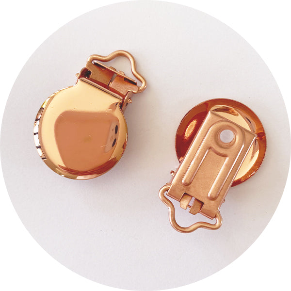 Our rose gold metal pacifier clip is 22mm round. Clips are lead and nickel free.