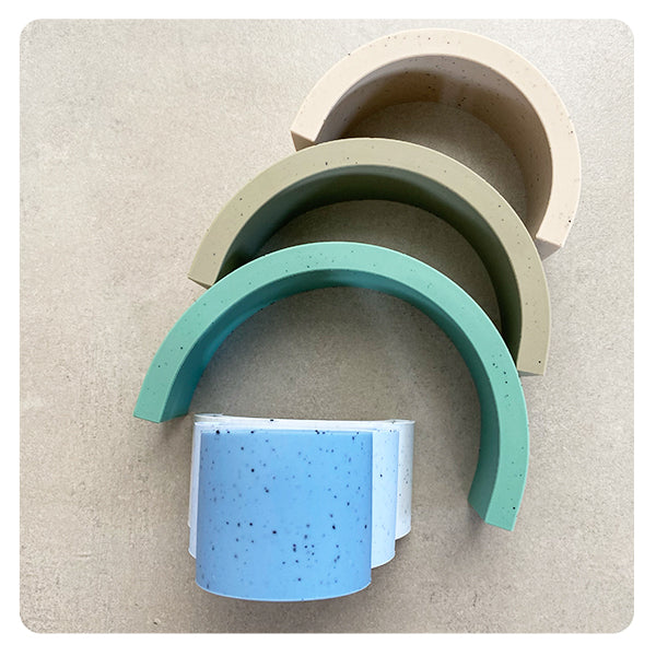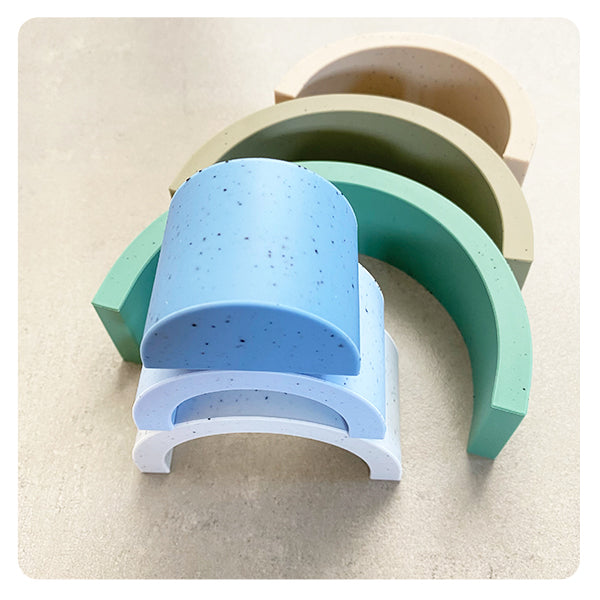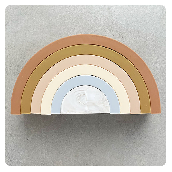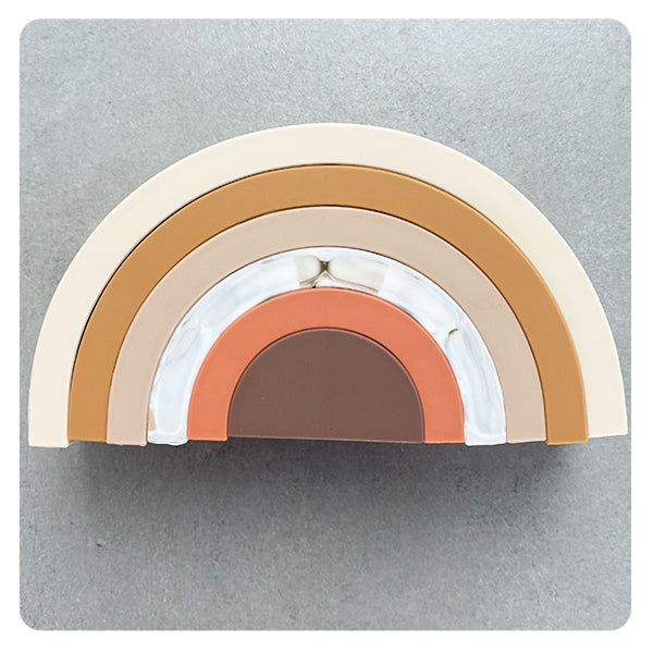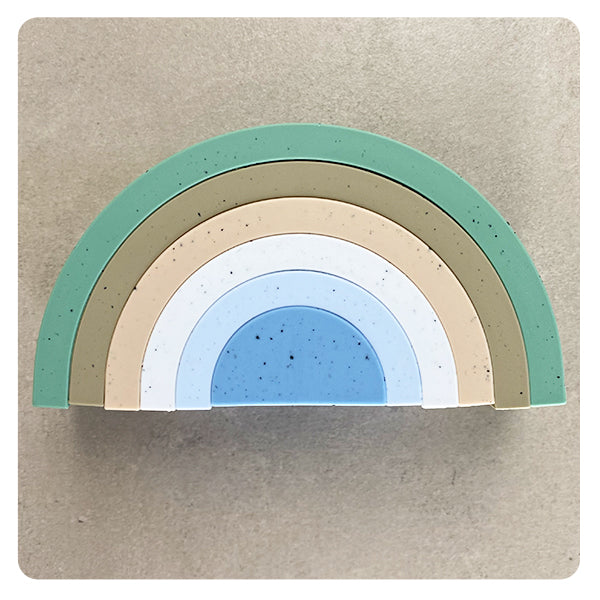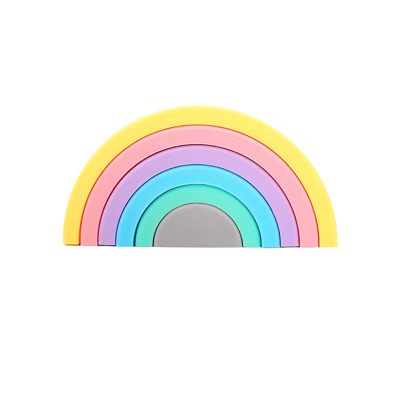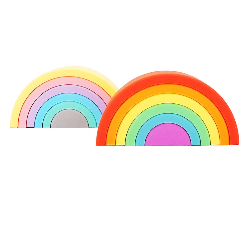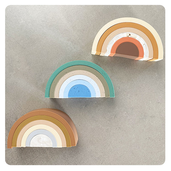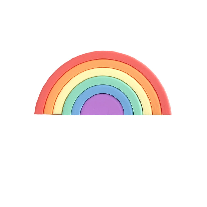 Rainbow stacking toys are open ended toys. Open ended toys are toys that leave it up to the child to create a story in and around the game. In this way, the toy strengthens the child's imagination and creativity. The Silicone Rainbow Stacker is a 6 piece rainbow that can be used as a teether, for stacking, for building or even as bath toys.