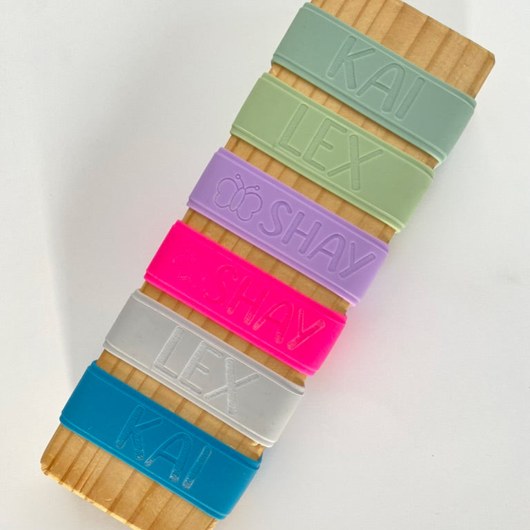 Introducing our personalised water bottle bands, the perfect accessory for labelling your baby's bottles, sippy cups, and water bottles. These bands are made from high-quality engraved silicone and feature a straight edge design. With an array of colour options and 4 font choices available, you can customize these bands to suit your style.