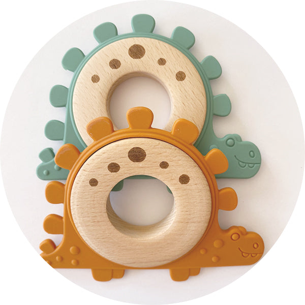 Our silicone & wooden dinosaur teether is ready to provide soothing help for teething and itchy gums. The raised ridges provide extra sensory relief.
